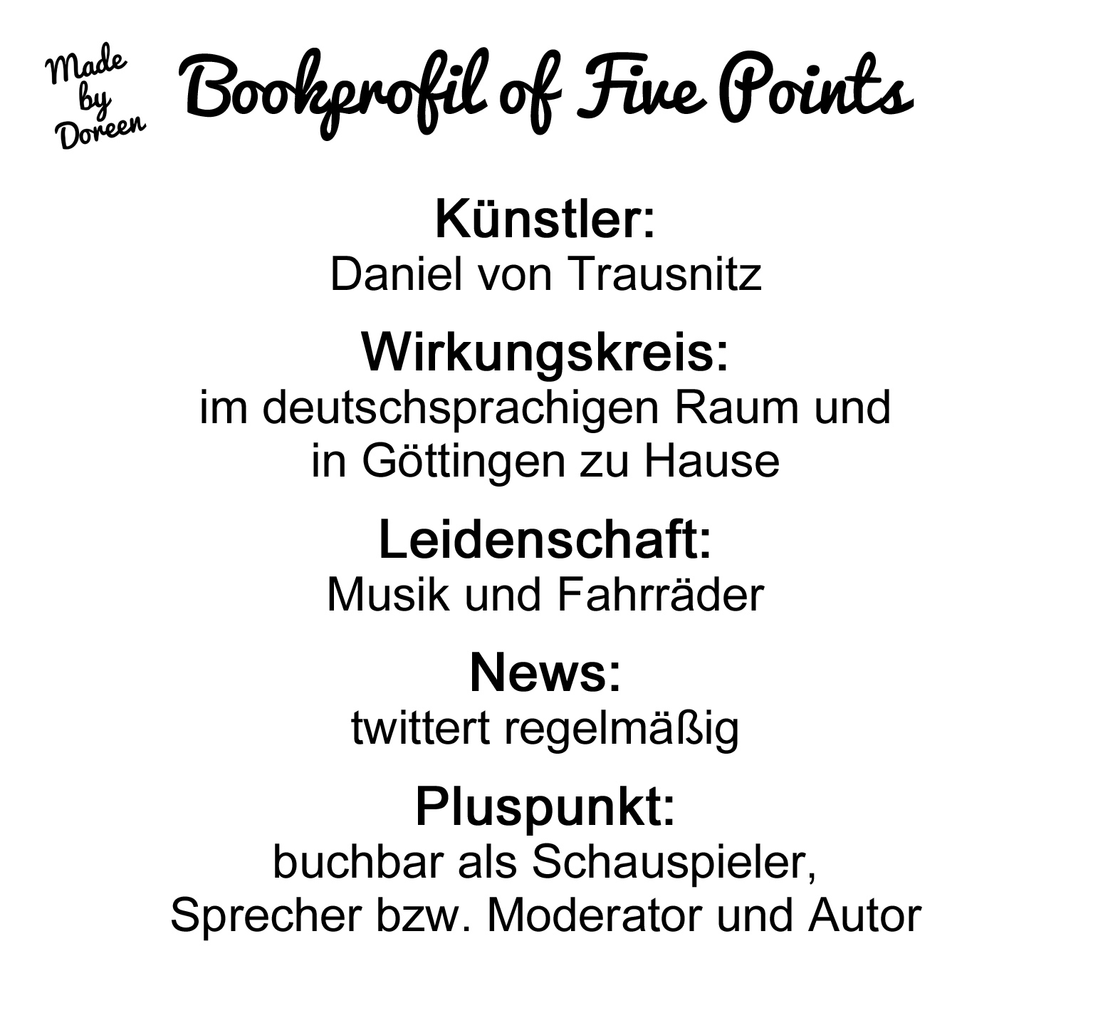 Künstlerisch in etlichen Disziplinen zu Hause, das ist Daniel von Trausnitz! Er ist unter anderem Schauspieler Sprecher, Autor und Musiker in einem. Eine interessante Persönlichkeit, der als Buchbranchenmitglied nicht nur einen Verlag gegründet hat, sondern auch auf seinen Veranstaltungen gern humorvoll Literatur von sich gibt. Er ist keiner, der sich spezialisiert hat, sondern seine vielen […]