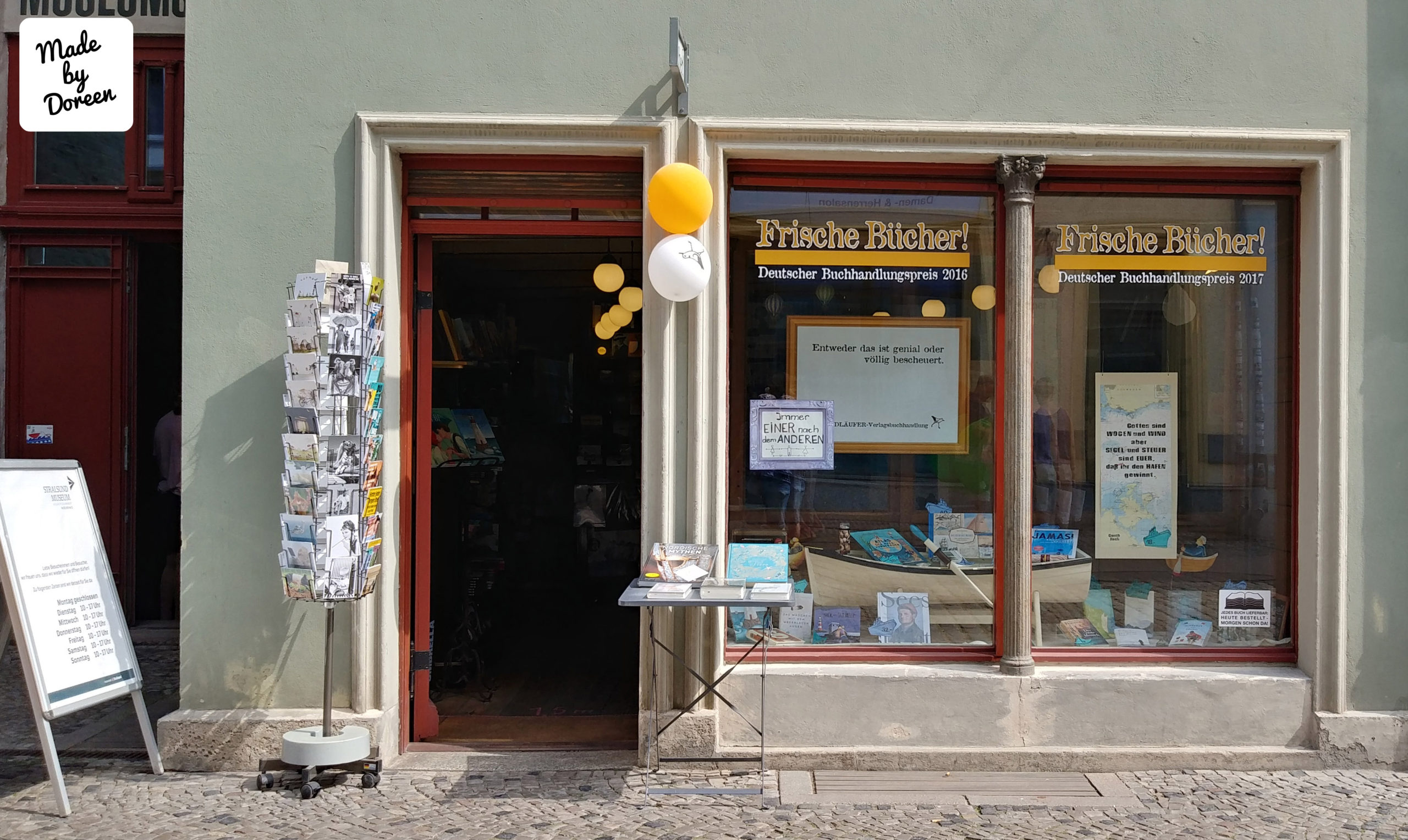 In einem der ältesten Gebäude neben dem Museumshof in Stralsund befindet sich seit dem 11. September 2014 eine hübsche, nur 24 Quadratmeter große Buchhandlung, die mit viel Engagement für Ihre Kunden und der Leidenschaft für Bücher geführt wird. Inhaberin Katrin Hoffmann hatte mit ihrem Mann Peter Hoffmann vor Jahren schon den Traum in das kleine Geschäft mit den Erzgebirgsprodukten einzuziehen und als er wahr wurde, haben sie ihre Chance ergriffen. Vier Jahre später wurden sie vom Börsenblatt zur Schönsten Buchhandlung Deutschlands gekürt. Diese Auszeichnung hängt hinter der Kasse und diese wurde, meiner Meinung nach, auch zurecht verliehen!
