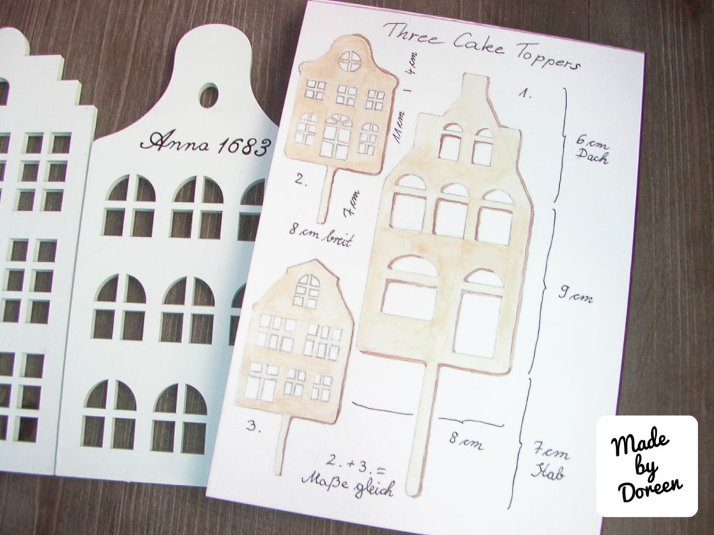 Das zweite Projekt befasste sich mit Kuchendekoration aus Holz. Mir schwebte eine Art Häuschen vor, das man auch für andere Dekorationszwecke verwenden kann und ich hatte die Idee meine eigene Kuchendeko zu kreieren. Was eignet sich da besser, dachte ich mir, als sie auf ein Blatt Papier zu bannen. Beim Vorzeichnen der Umrisse der Häuser suchte ich mir Fotos von kompletten Hausfronten aus dem Netz heraus und stellte mir meine eigenen Hausansichten zusammen. Schwierigkeiten hatte ich beim Einzeichnen der Fenster sowie der Fensterstege, die jeweils einen angemessenen Abstand dazwischen erforderlich machten. Es gestaltete sich zwar schwierig, aber ich habe es hinbekommen umzusetzen. Danach überlegte ich mir eine passende Holzfarbe, die gut die Farbe von Holz nachahmen sollte. Das Ergebnis ist hier unten zu sehen.